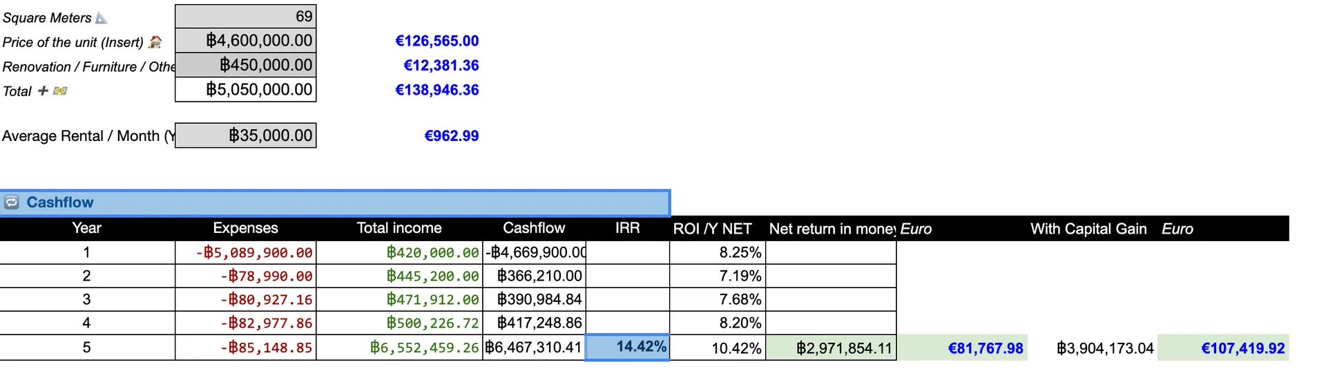 - Purchase price: 4,600,000 THB (≈ 121,000 EUR)